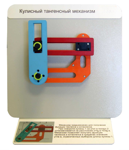 Модель действующего кулисного тангенсного механизма предназначена для демонстрации получения с помощью данного механизма функции тангенса и котангенса.
