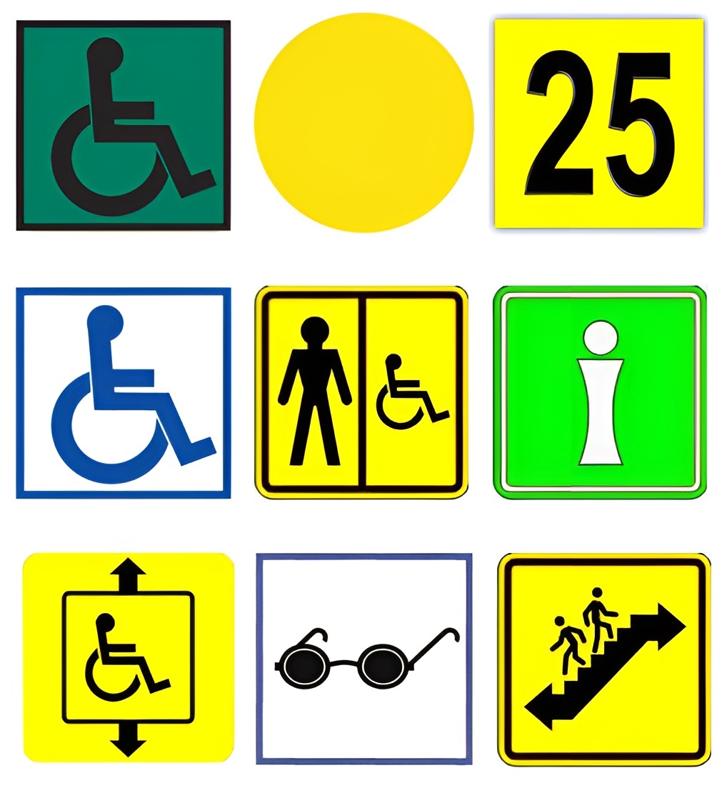 Плоские знаки, таблички и вывески используются в случае невозможности использовать тактильный знак (например, если знак не доступен для ощупывания), а также в случаях, когда информация не носит информативный характер для людей с нарушением зрения (любые прочие изделия).