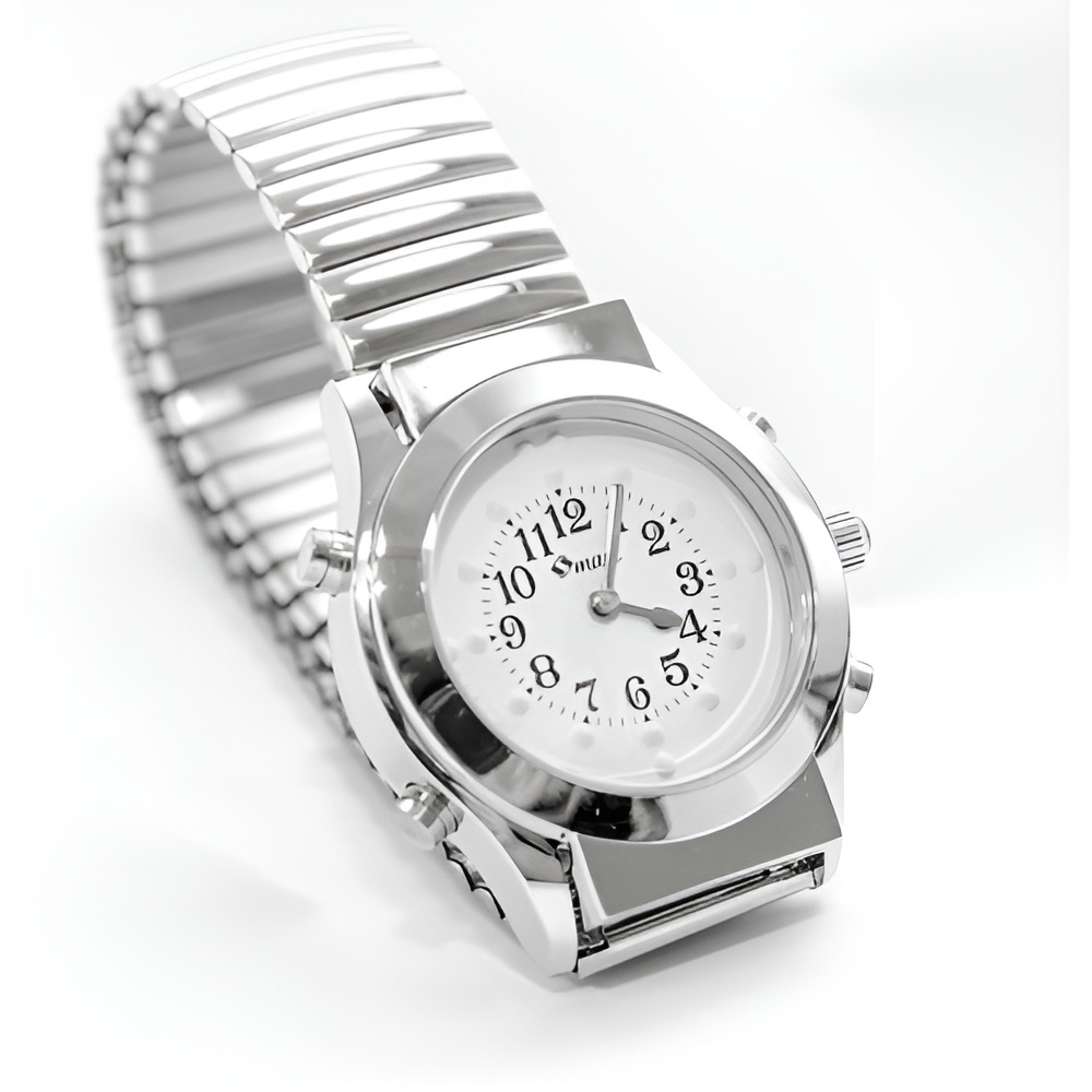 Наручные кварцевые часы оповещают женским голосом на русском языке о текущем времени после одного нажатия на кнопку. Также возможно бесшумно определить время с помощью специальных меток, открыв крышечку часов. Часы снабжены надежными стрелками. Отлично подходят для повседневного использования. Открытие крышечки на 6 часов. Ремешок: стальной растягивающийся.