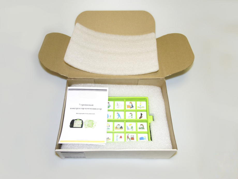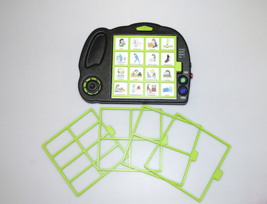 Коммуникатор имеет следующие съёмные рамки, разделяющие кнопки коммуникатора на секции: Рамка 1 для одной картинки, Рамка 2 для двух, Рамка 3 для четырёх, Рамка 4 для восьми, Рамка 5 для шестнадцати различных картинок. Под рамки вставляются карточки с картинками. Коммуникатор имеет 2 кнопки – переключение уровня и выбор рамки, а также не менее 8 светодиодов, отображающих уровень и индикацию включенного устройства. Корпус устройства и рамок – пластик. Рамки, элементы коммуникатора выполнены в контрастном цвете. Элементы питания – встроенная аккумуляторная батарея. Зарядное устройство в комплекте.