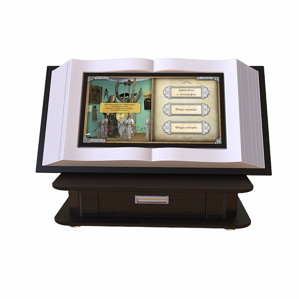 Мультимедийная интерактивная настольная книга – это мультимедийное оборудование. В нем объединены традиционный дизайн книги и интерактивные технологии. Предназначено для установки в залах библиотек, музеях, выставочных комплексах, архивах, экспозициях, шоу-румах и местах, где знакомят посетителей с информацией.