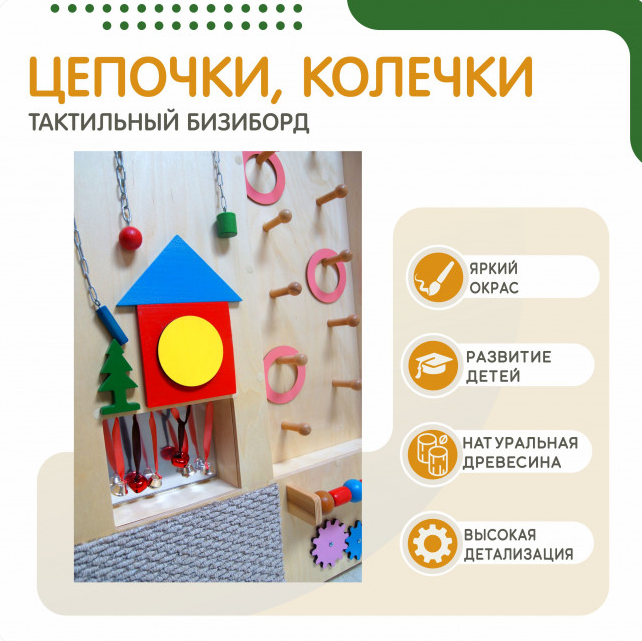 Бизиборд с цепочками и колечками - это яркий и практичный игровой элемент, изготовленный из высококачественной древесины. Он представляет собой уникальный набор разнообразных элементов, включающий тактильные области, ксилофон, кольцеброс, колокольчики на веревочках, фигурки на цепочках, бубен, металлические трубочки, счеты, систему шестеренок и тактильный лабиринт. Преимущества игрушки: