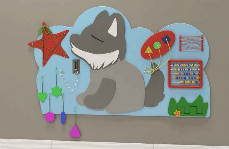 Настенная панель в виде волка №1 — это ценный детский игровой модуль, ведь с его помощью можно не просто занять ребёнка, но сделать это с пользой для его развития. А ещё настенную панель легко расположить в небольшом помещении благодаря компактному исполнению, что выгодно отличает её от объёмных аналогов. Поверхность обработана специальным образом и имеет многослойное покрытие из экологически безопасных материалов.
