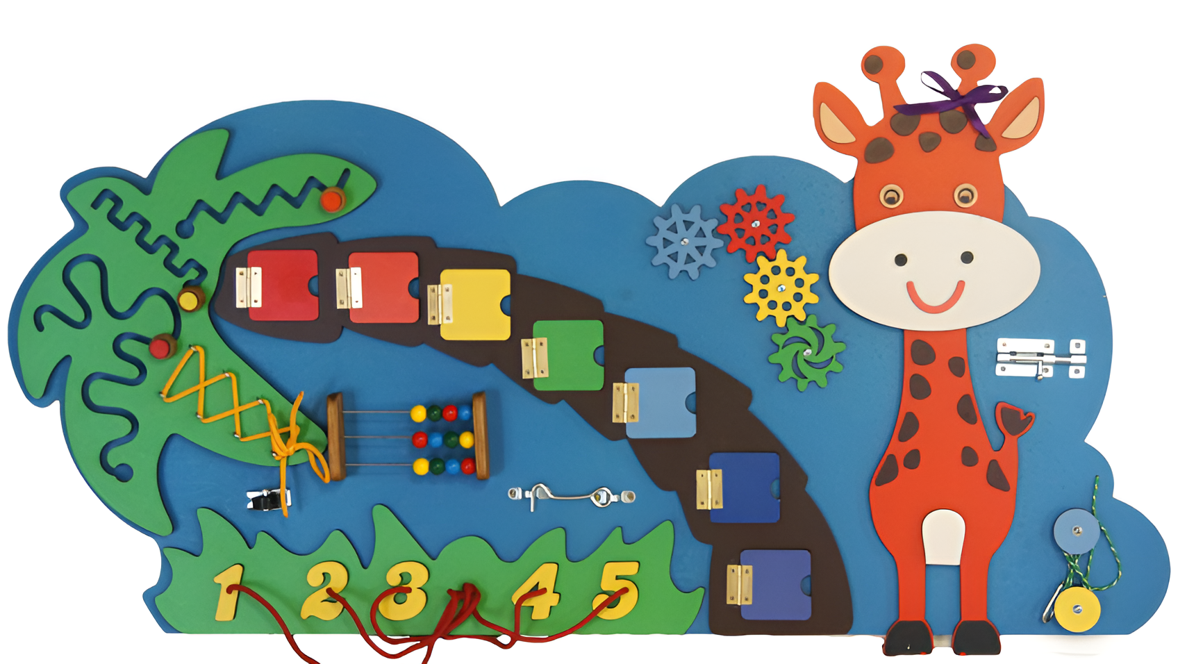 Бизиборд в виде жирафа – оптимальное решение для небольших помещений, потому что он сохраняет игровую ценность и экономит пространство. Основа выполнена в виде фиолетового облачка, на котором размещён весёлый Жирафик, пальма и полянка с зелёной травкой. Все края закруглены и обработаны по специальной технологии, что гарантирует безопасность в использовании даже самыми маленькими детками.