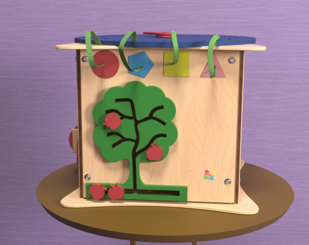 • Покажите ребенку, как работают элементы каждой из сторон бизикуба: сортер с геометрическими фигурками, лабиринт в виде дерева, передвижные фишки в форме яблок. Бизикуб позволяет повторить элементарные навыки в повседневной жизни: зашнуровать ботинки, застегнуть или расстегнуть кофточку, открыть или закрыть дверь. Таким образом, малыш становится самостоятельным.