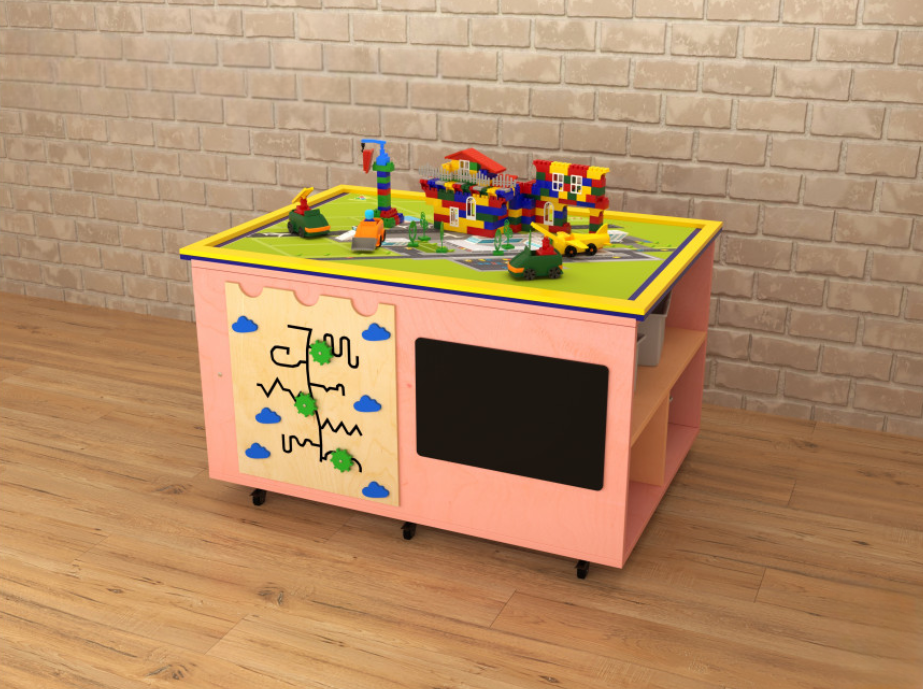 Ландшафтный стол с локацией два берега – многофункциональный развивающий детский игровой модуль. Главное его преимущество – рациональное использование имеющихся площадей – на столешнице расположена ландшафтная локация реки с двумя берегами, а на боках стола – тактильный лабиринт, грифельная доска и полки для хранения игр; все эти преимущества делают стол представленной модели незаменимым элементом оснащения пространства для занятий с детьми. Ландшафтные столы широко используются для групповых и индивидуальных занятий с детьми дошкольного и младшего школьного возраста дошкольными педагогами и некоторыми узкими детскими специалистами – логопед, дефектолог, психолог.