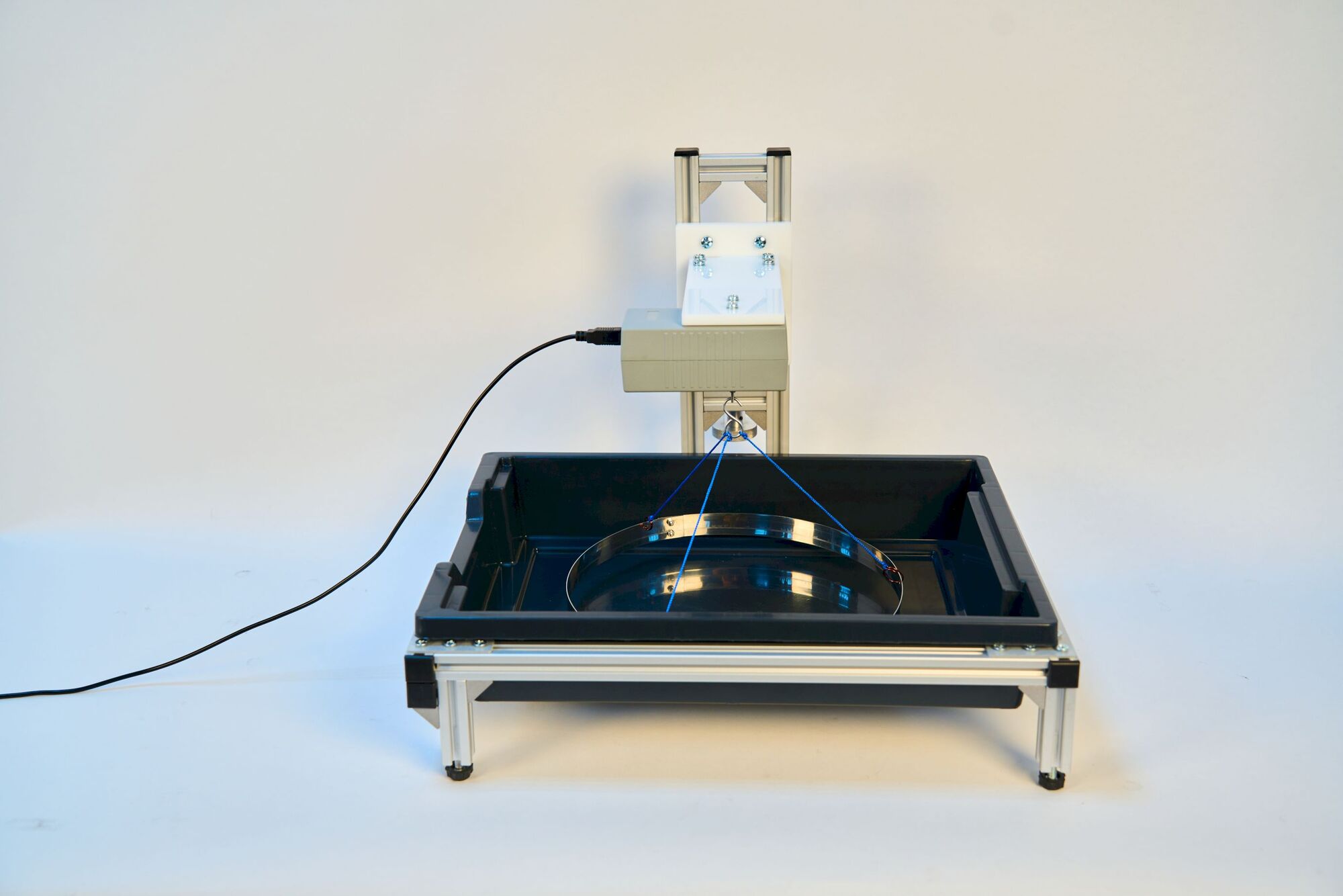 Установка включает тонкий металлический обруч, который с помощью нитяного подвеса крепится к датчику силы. Датчик силы монтируется на перекладине в верхней части корпуса установки и может перемещаться в вертикальном направлении c помощью ручного винтового привода. Кювета с исследуемой жидкостью устанавливается на основании установки.
