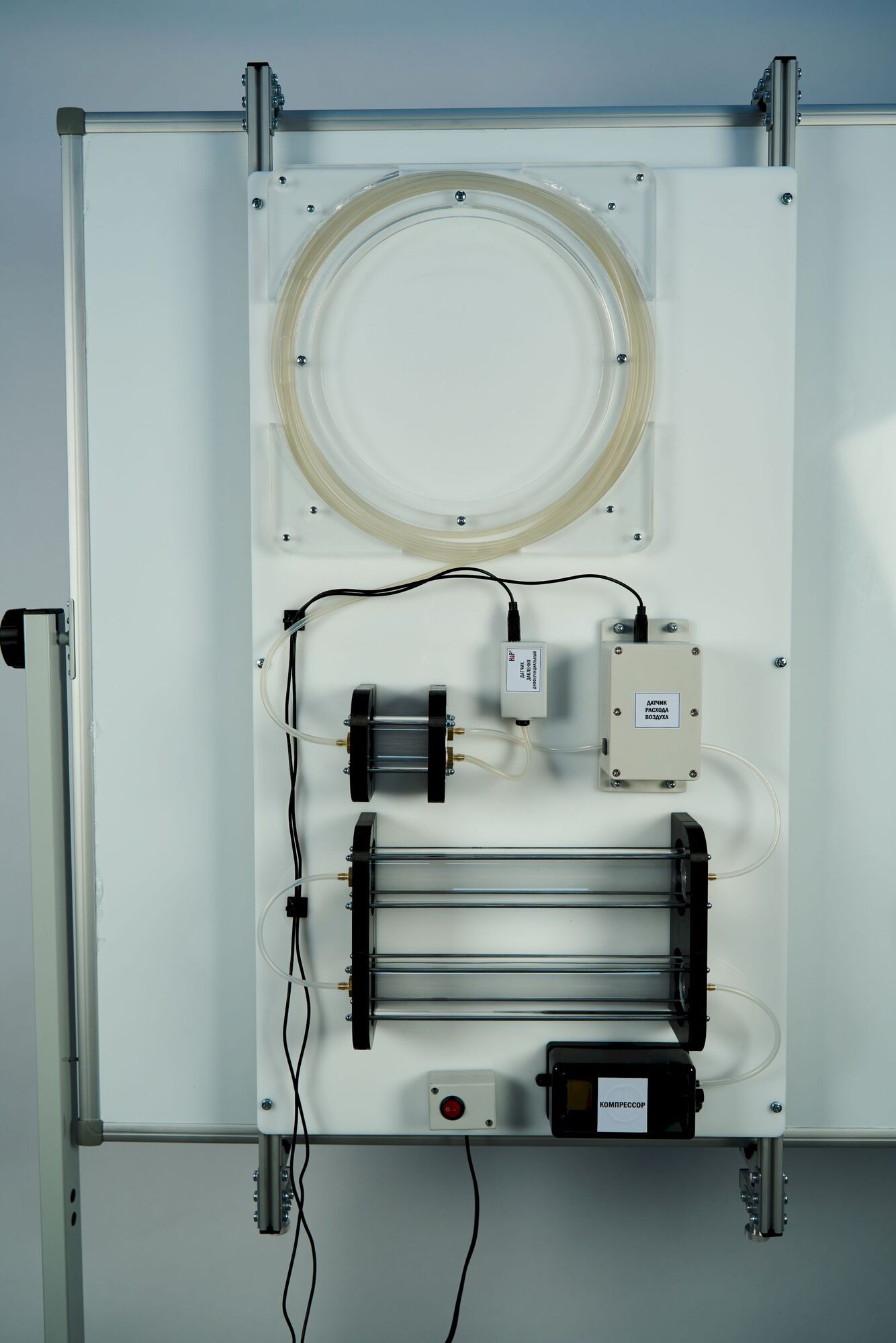Лабораторная установка выполнена в виде настольного стенда, на котором смонтированы все элементы установки и соединяющие их трубопроводы. Перепад давления на трубке малого сечения измеряется с помощью дифференциального датчика давления, один из штуцеров которого соединен с воздушной камерой, а другой – с атмосферой. Изменение расхода воздуха осуществляется регулятором на воздушном компрессоре и контролируется с помощью цифрового датчика расхода воздуха.