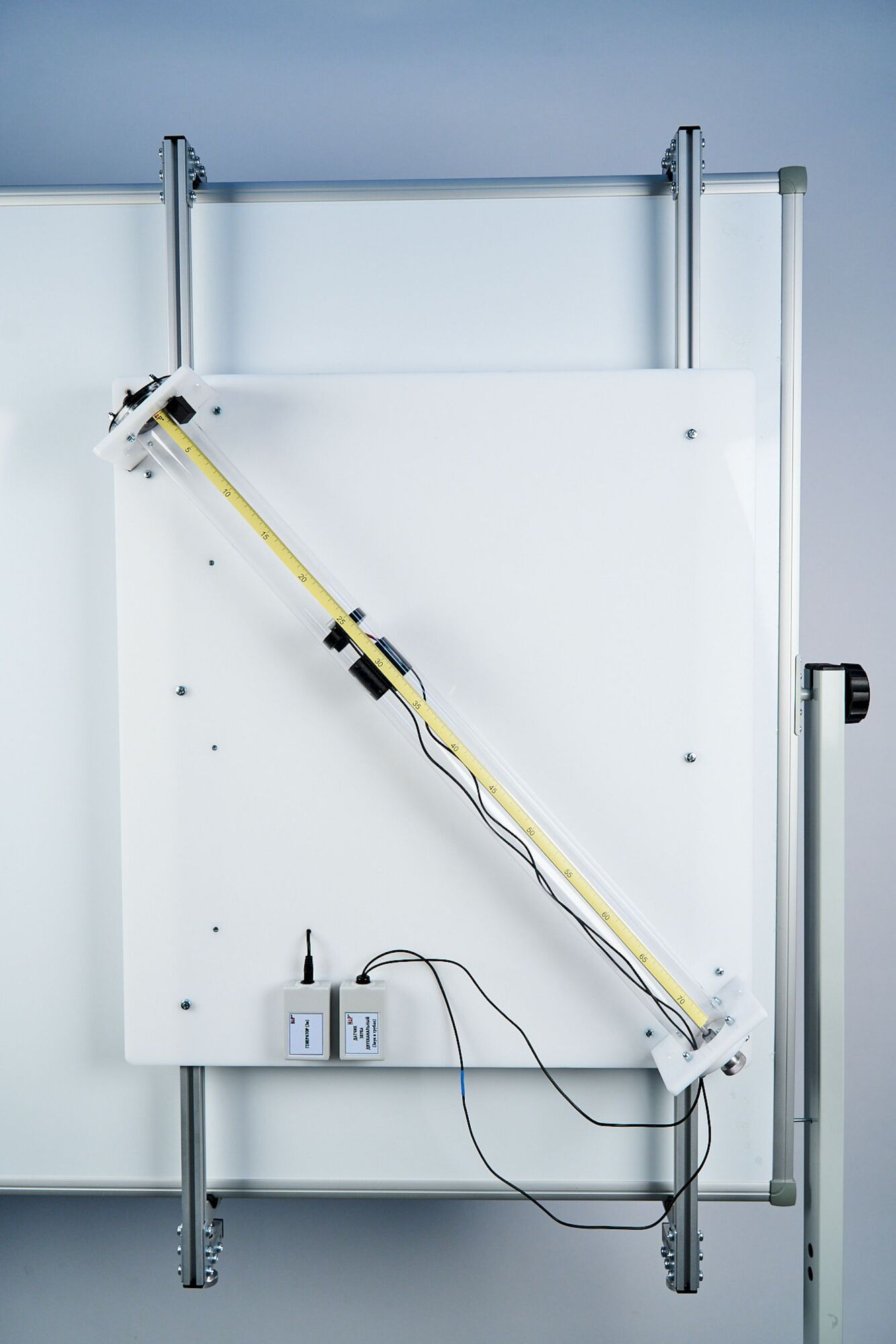 На каркасе из металлических труб установлена звуковая труба, в которой реализуется распространение звуковой волны и обеспечивается измерение скорости звука двумя методами. Контроль параметров звуковой волны в двух точках пространства осуществляется с помощью двухканального датчика звука, имеющего два микрофона. Конструкция установки позволяет перемещать одиниз микрофонов вдоль трубы и определять его координату по специальной шкале. Источником звука служит динамик, который под ключается к USB-порту компьютера и управляется с помощью программного обеспечения.