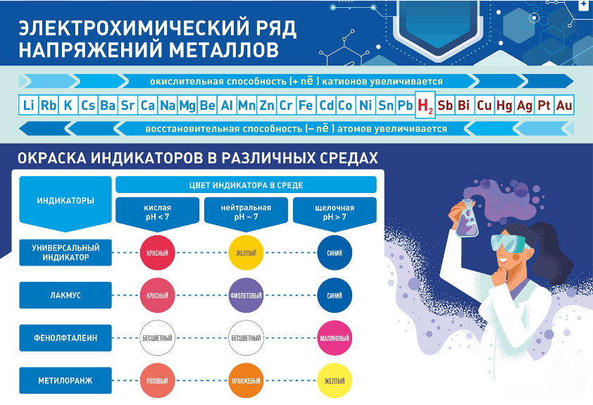 Главная Каталог Стенды Кабинеты Химия Стенд "Электрохимический ряд и окраска индикаторов в различных средах"
