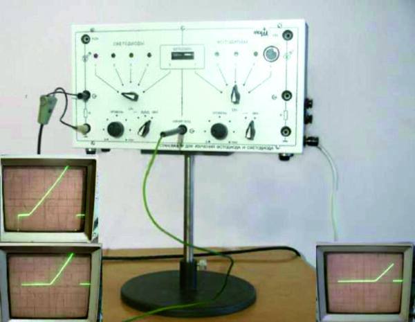 Установка состоит из стенда с наборами фотодиодов и светодиодов, оптопары и измерительных приборов*: измерителей электрических величин (напряжения, тока и т.д.) и осциллографа.
