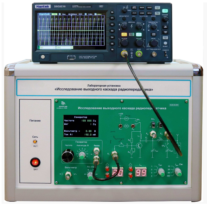 Лабораторная установка формирует одно рабочее место и обеспечивает проведение экспериментов по изучению принципов согласования выходного каскада передатчика с антенной, исследованию регулировочных и нагрузочных характеристик выходного каскада при различных способах подключения антенны.