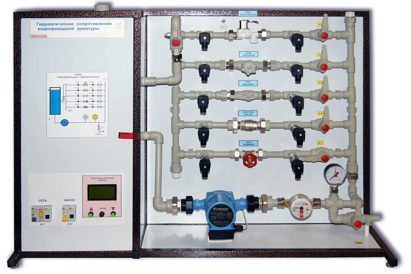 Комплекс предназначен для определения гидравлического сопротивления арматуры. Позволяет изучить различные типы арматуры и их влияние на расход воды. Студент может собирать свои схемы подключения, определять давление на арматуре при каждом фиксированном расходе воды, выявлять эффективность применения того или иного типа арматуры.