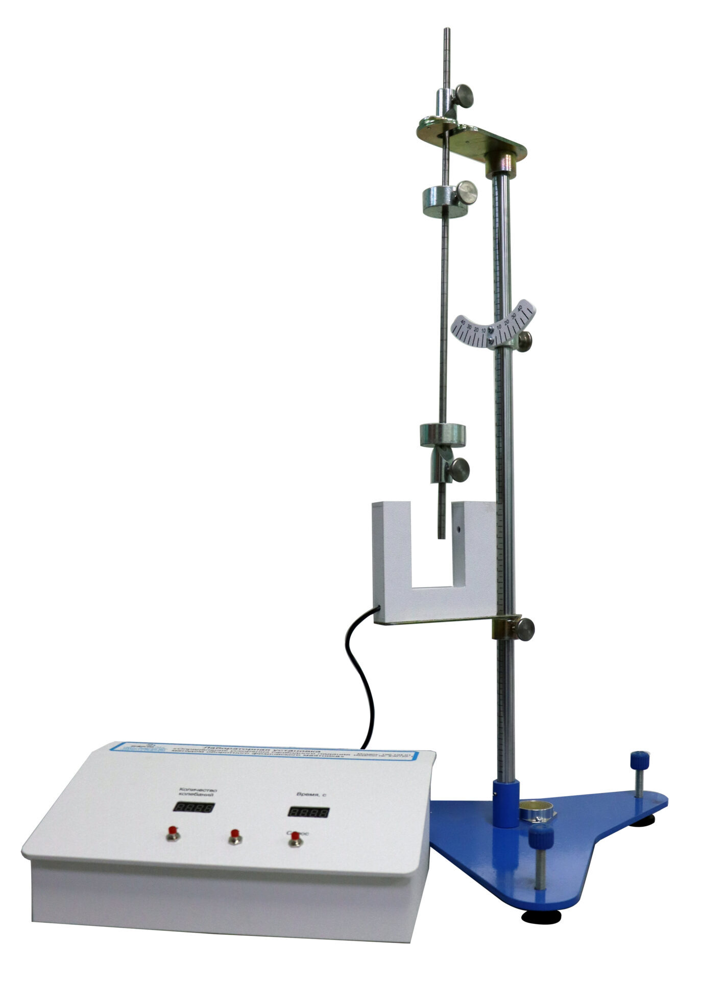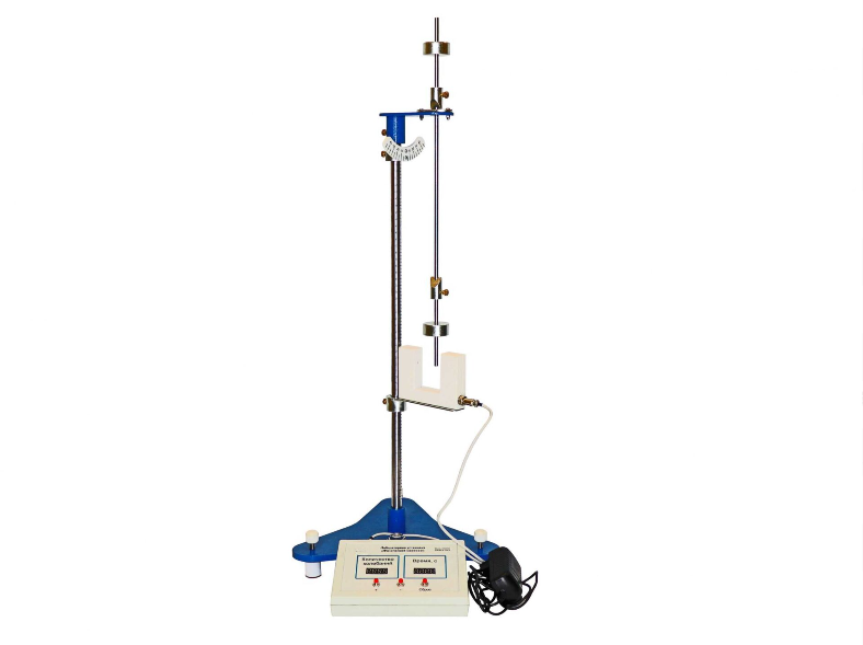 Лабораторная установка представляет собой основание с установленным вертикальным стержнем, на котором закреплен оптический датчик с регулировкой высоты и опорный кронштейн, на который опирается опорная призма физического маятника. Опорный кронштейн свободно перемещается по стержню, что позволяет изменять плечо маятника.