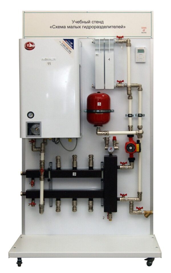 Учебный стенд позволяет рассмотреть систему отопления, собранную из полимерных труб. В наличии обозначения направления жидкости на всех узлах стенда.
